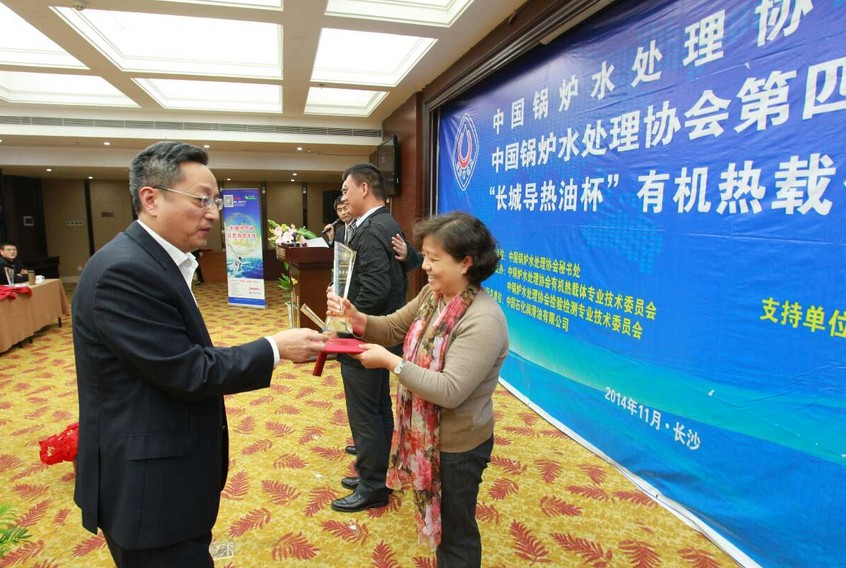 中國鍋爐水處理協(xié)會檢驗檢測技術(shù)委員會主任、江蘇省特檢院常州分院院長李秀中,為我公司王慧經(jīng)理頒發(fā)獎杯與證書。