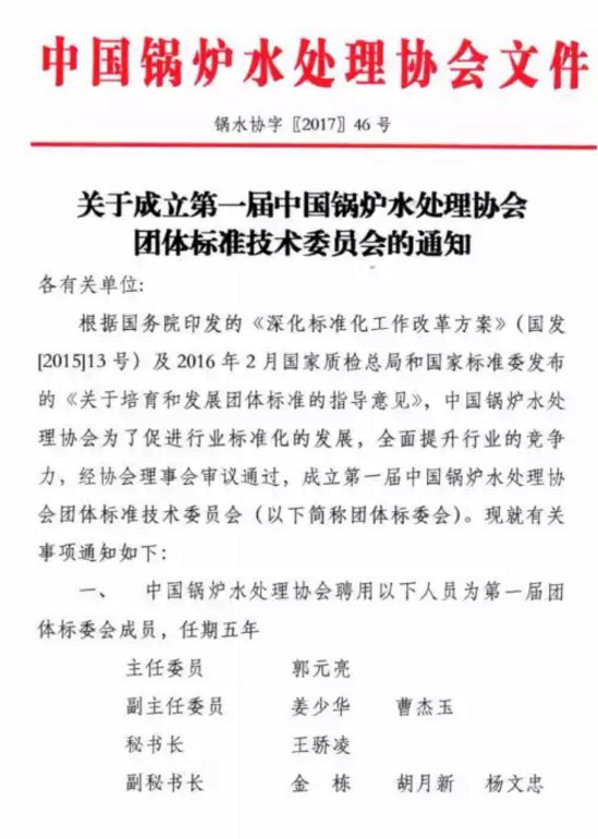 關于成立第一屆中國鍋爐水處理協會團體標準技術委員會的通知!